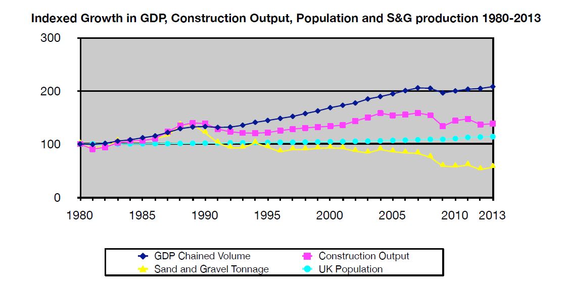 The following graph, which shows the 30+ year trends for various UK outputs, was prepared by Bachport and is included in the report. What it shows is both counter-intuitive and contrary to what we are always told (i.e. to support growth we need to dig up more sand and gravel).